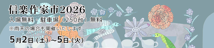 おかげさまで「信楽作家市」は20年目の佳節を迎えます。毎年5月2日〜5日の4日間、滋賀県立陶芸の森 太陽の広場にて、作家自ら展示即売を行っています。(入場料無料)4日間で5万人の来場者にお越しいただき、おかげさまで県内屈指の人気イベントとなりました。ひとえに楽しみにしてくださる多くのファンの皆様のおかげと、誠に感謝申し上げます。